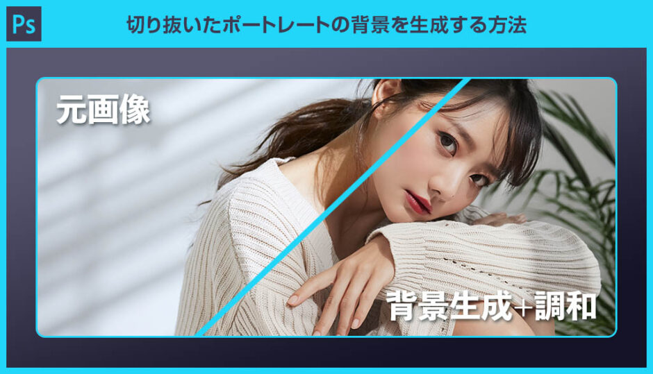 Photoshop(フォトショップ)で切り抜いたポートレート写真の背景を生成する方法をフォトショ初心者の方に詳しく解説します。人物に焦点を当てたポートレートの人物のみ切り抜き、背景を生成して照明などの調整を簡単に行う事ができます。