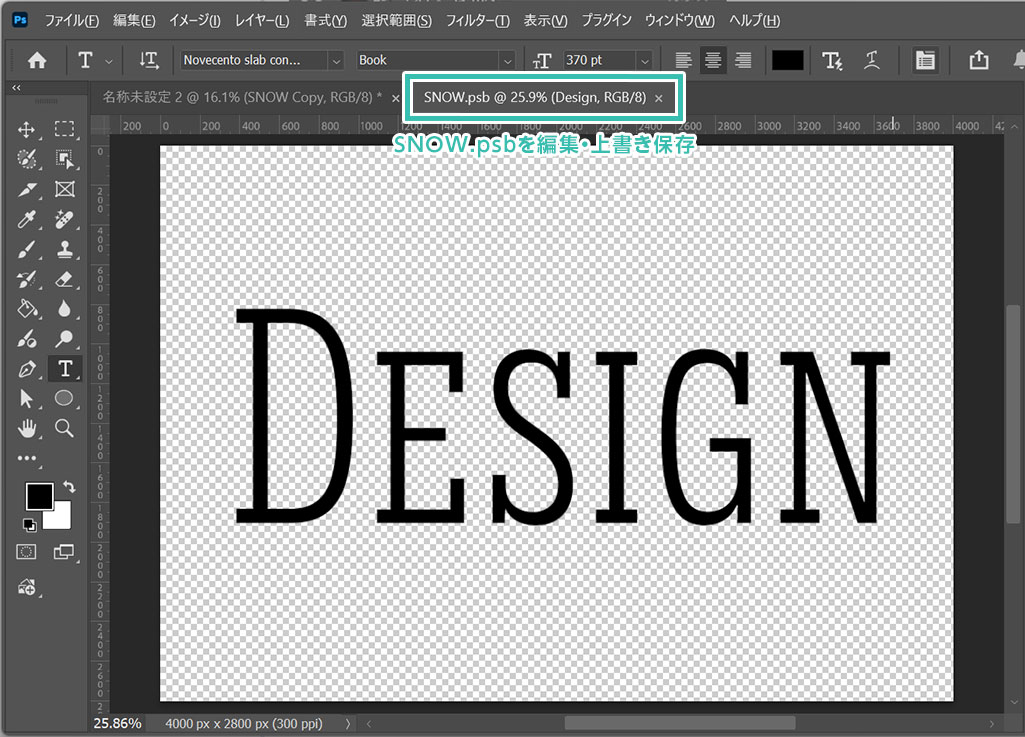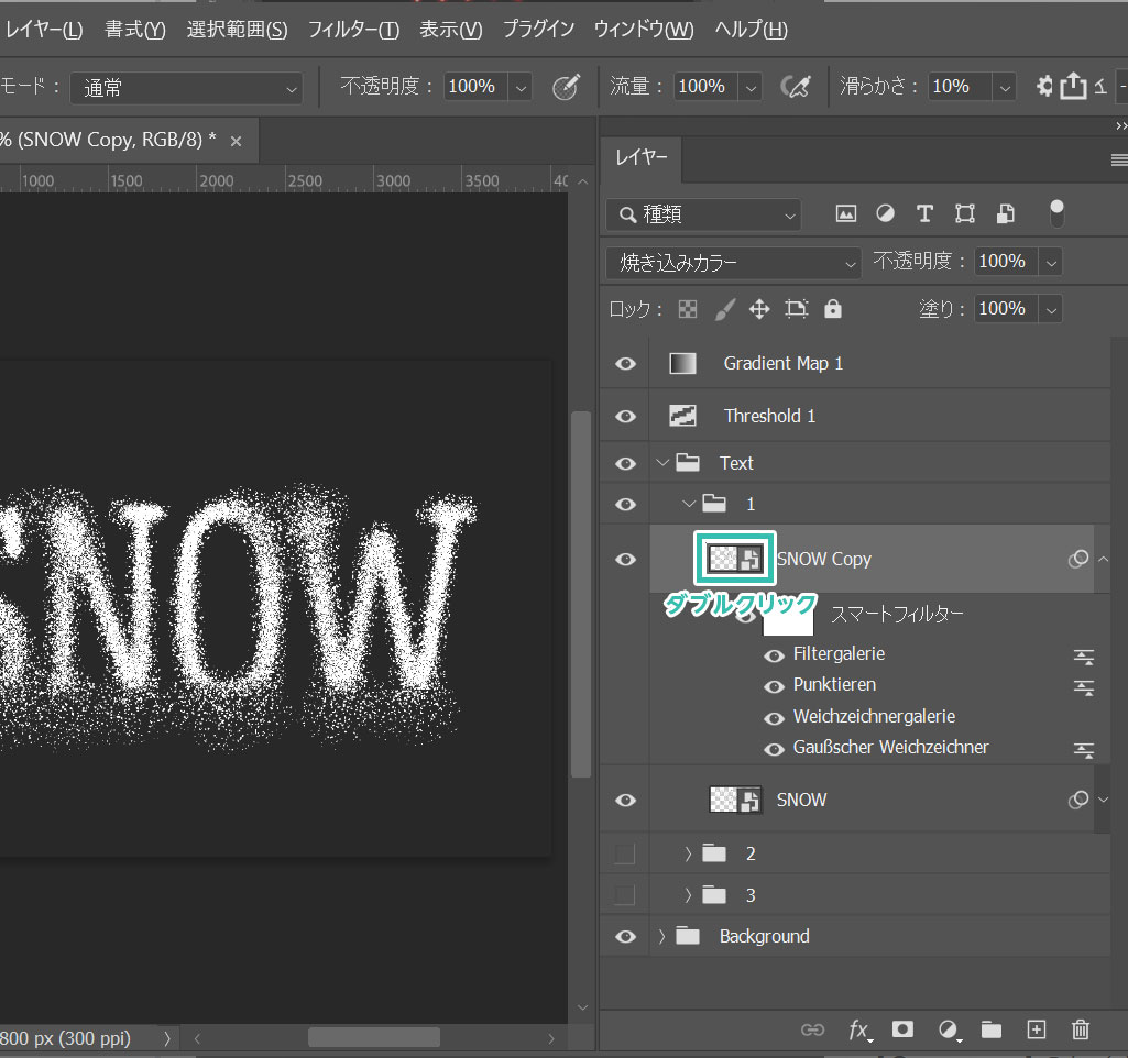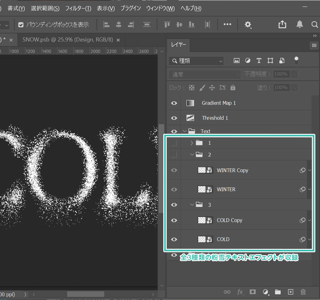 今回使用したエフェクトは [ Snowy Winter Text Effect ] です。スマートオブジェクトのレイヤーサムネールをダブルクリックし、PSB内を差し替えるだけでオリジナルのロゴやタイポグラフィが作れるチート素材!
