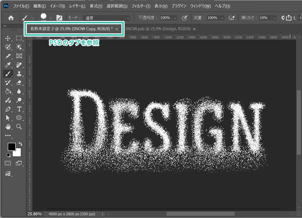 Photoshop(フォトショップ)で舞い散る粉雪の様な質感のロゴが作れるテキストエフェクトPSDの使い方と作例をフォトショ初心者の方に詳しく解説します。