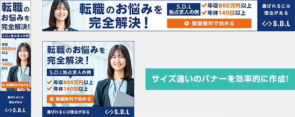 同じ要素でサイズが違うバナー広告を1つのPSDで簡単に作れます。Photoshopがあればデザイナー要らずかも!?