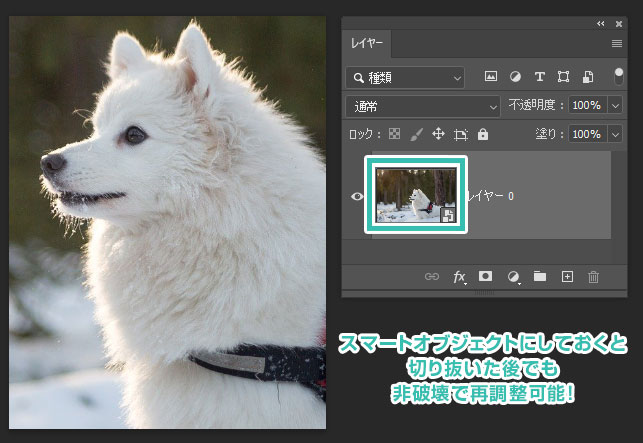 通常のラスターレイヤーの状態で切り抜くと、切り抜きエリア外の情報は破棄されますが、スマートオブジェクトにしておくと切り抜いたエリア外の情報を保持したままなので再調整が可能です。