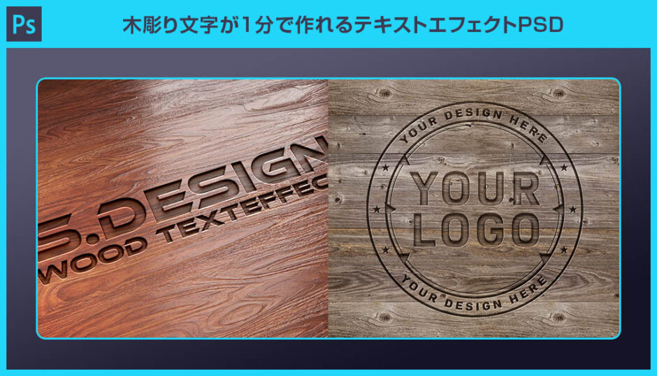 Photoshop(フォトショップ)でリアルな木彫り文字のロゴが作れるテキストエフェクトPSDの使い方と作例を詳しく解説します。