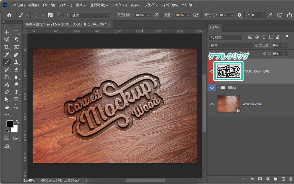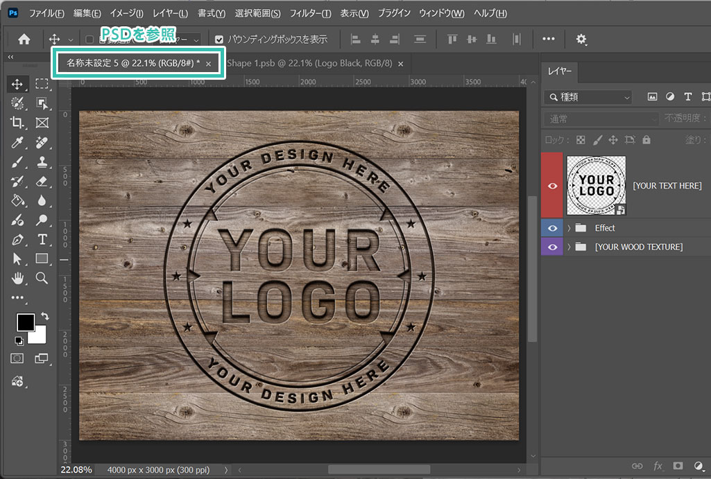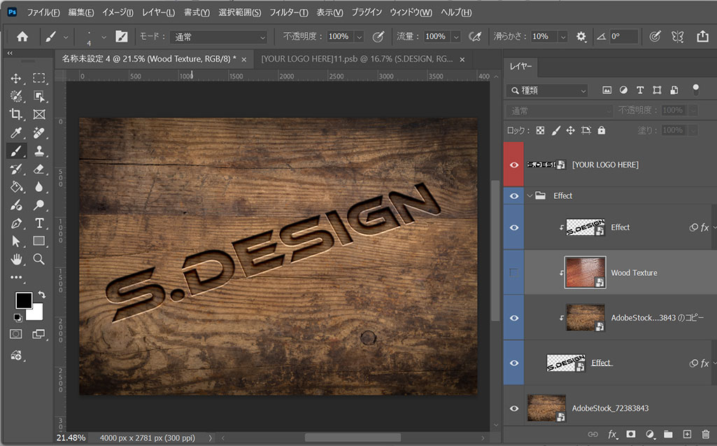 元のPSDを参照するとデザインが差し変わっている事が確認できます。[ Engraved Wood Text Effect Mockup ] を使えば先の木彫りとは違った雰囲気のロゴが1分で作れます。サイズも長辺が4000px、解像度が300px/inchもあるので十分印刷物にも使えます。