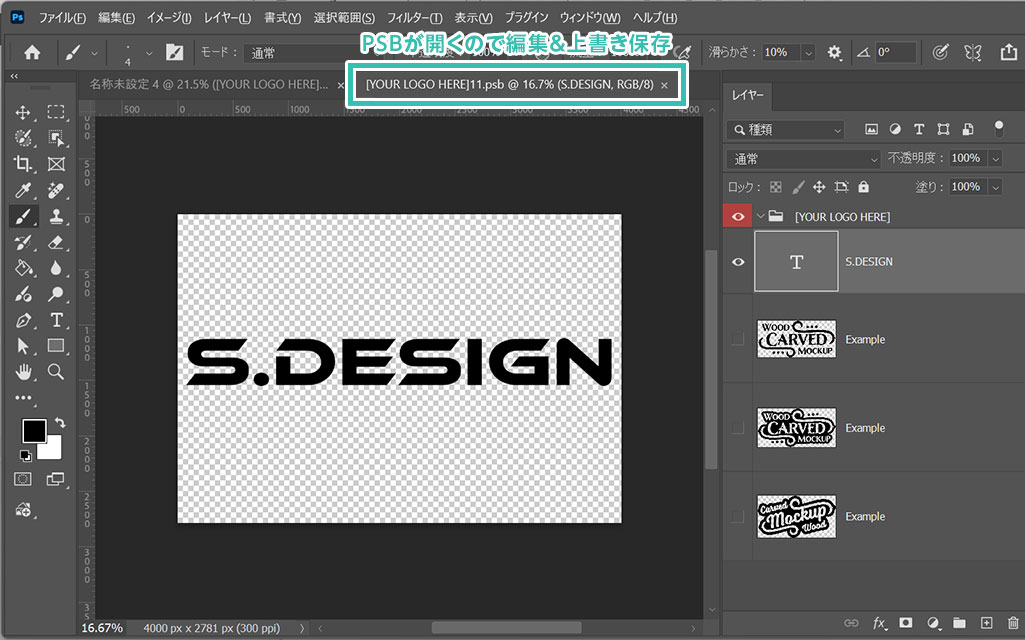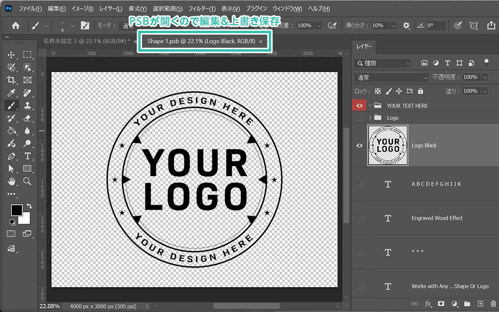 [ YOUR LOGO HERE11.psb ] が別タブで開きます。サンプルでいくつかロゴが入っていますが、[ 文字ツール ] でお好きな文字を入力、アイコン等を配置しましょう。