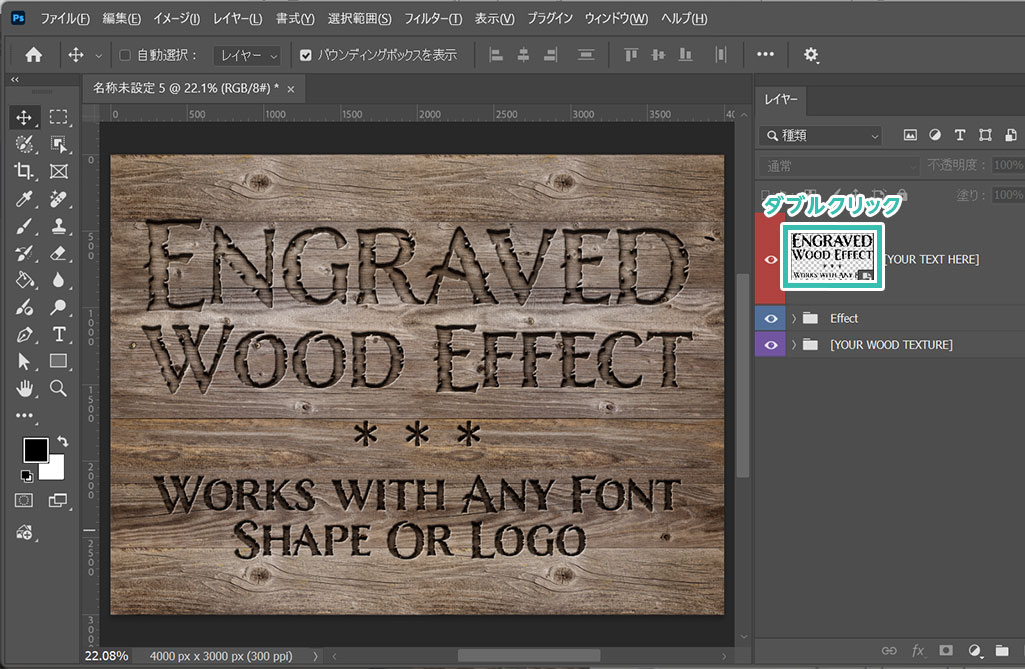 それではPhotoshopで木彫り風の表現ができるテキストエフェクトの使い方を解説します。