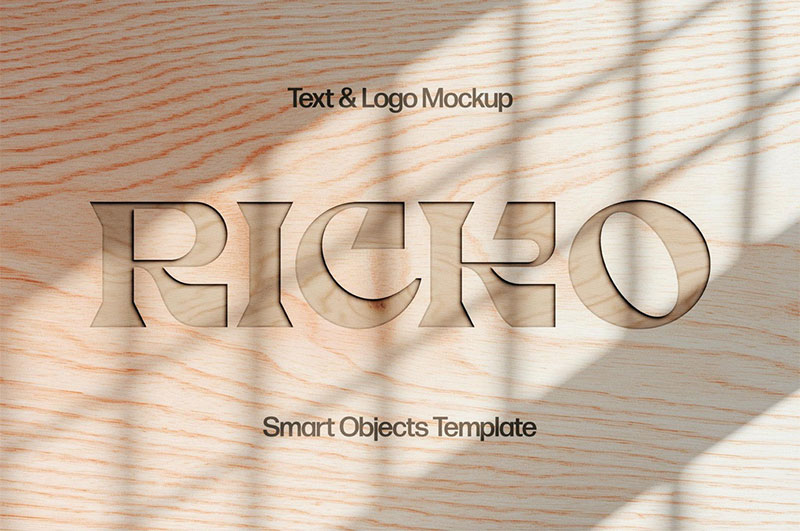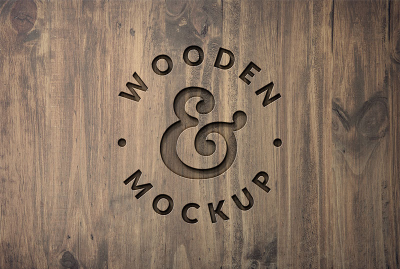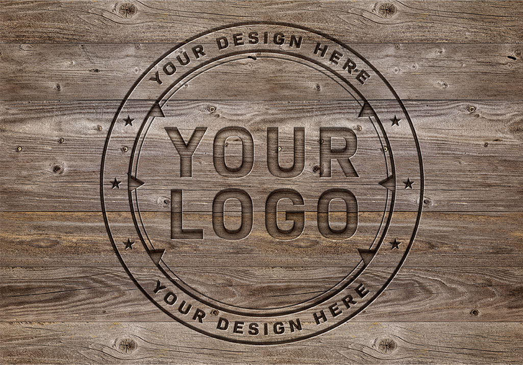 木の板を美しく彫り込んだロゴが再現できるテキストエフェクトPSDです。渋めの木目カラーで落ち着いた印象のロゴが作成できますよ。
