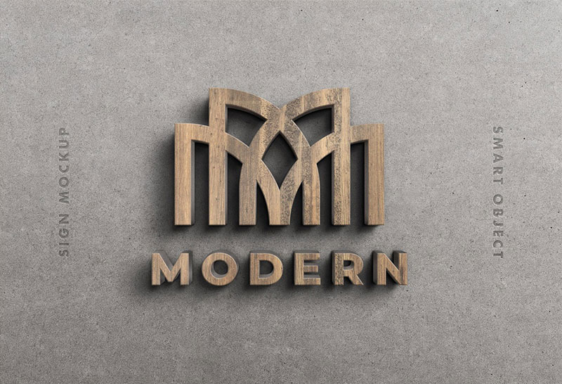 無機質なコンクリートのような壁に立体的な木のロゴがデザインされた絵が作れるモックアップ素材です。おしゃれな店舗やオフィスの看板みたいな世界観が作れます。